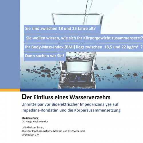 wir führen eine Studie zum Wasserverzehr vor einer Bioelektrischen Impedanzanalyse (BIA) durch, für welche wir junge, gesunde Probandinnen zw. 18 &25; Jahren im unteren BMI-Bereich (18,5 - 22 kg/m2) suchen.