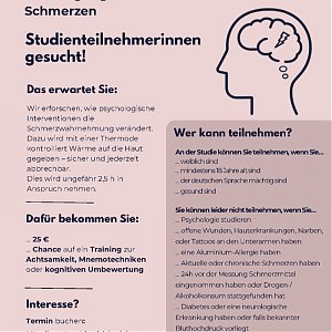 Wir erforschen, wie psychologische Interventionen die Schmerzwahrnehmung verändert. Dazu wird mit einer Thermode kontrolliert Wärme auf die Haut gegeben – sicher und jederzeit abbrechbar. Dies wird ungefähr 2,5 h in Anspruch nehmen.